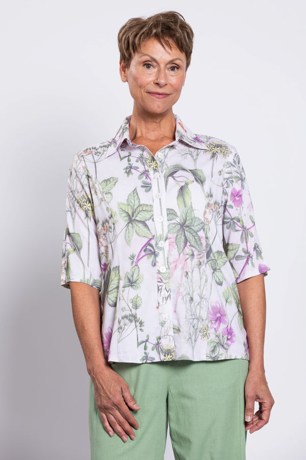A tailored blouse in cool, breathable Bamboo/Linen fabric. The Lorine features a shirt collar and princess seams. The sleeve falls just below the elbow with a small slit. Pairs nicely with a pant or skirt.