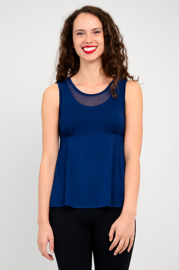 The Rhine Tank features mesh underlay to give the illusion of layering and a play on texture. The empire waist and fitted bodice contour the body for a refined look.