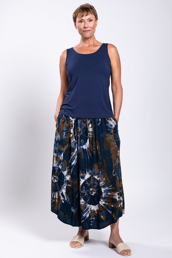 This skirt is a throwback to Woodstock with it's tie dye batik print. Style this with a simple tee and sandals for summer or a sweater and boots in fall. The perfect all season piece!