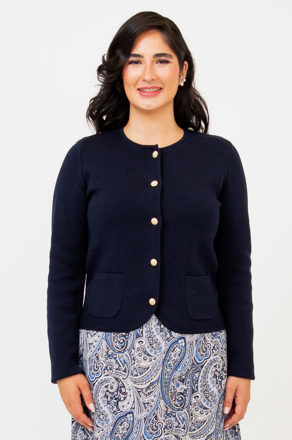 This stylish cardigan is structured and sophisticated. It blends comfort and elegance to provide a polished addition to any outfit.