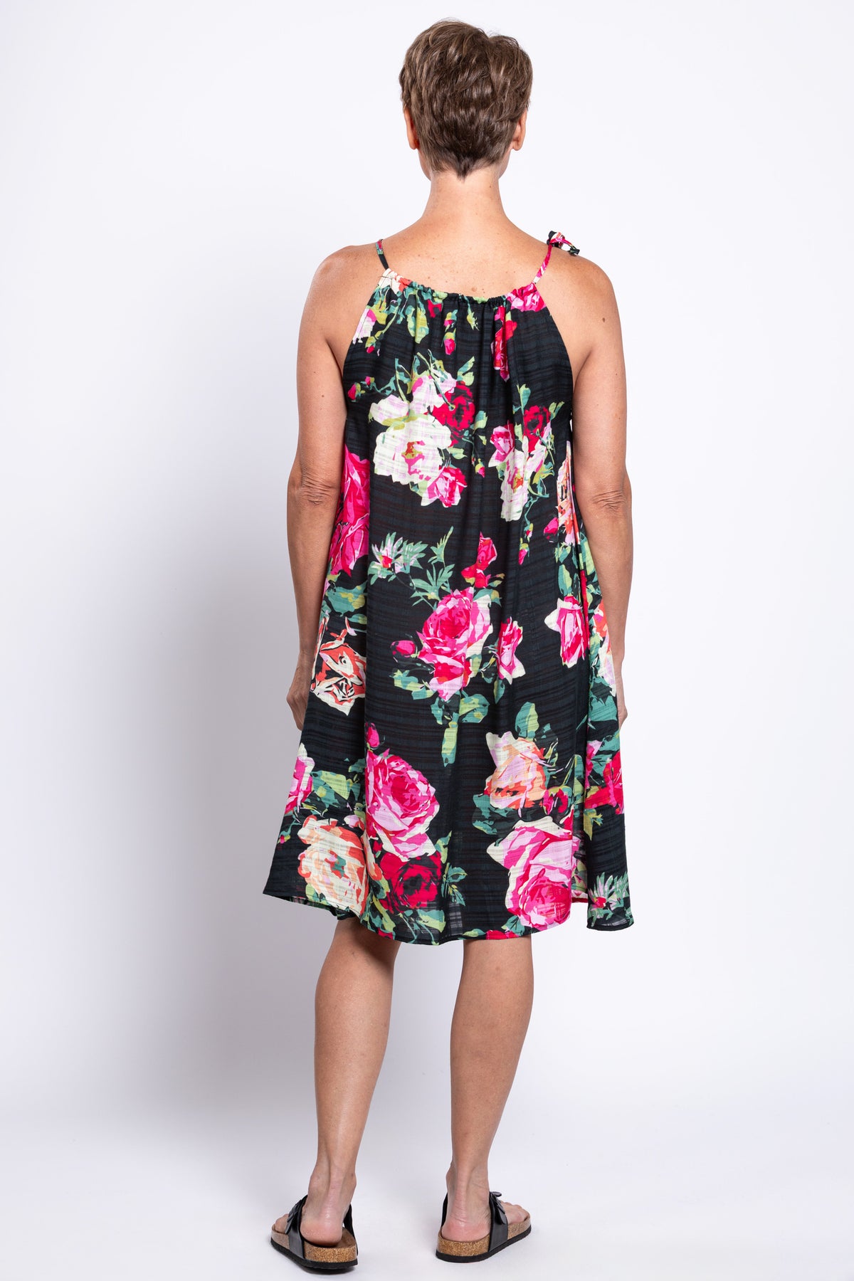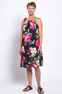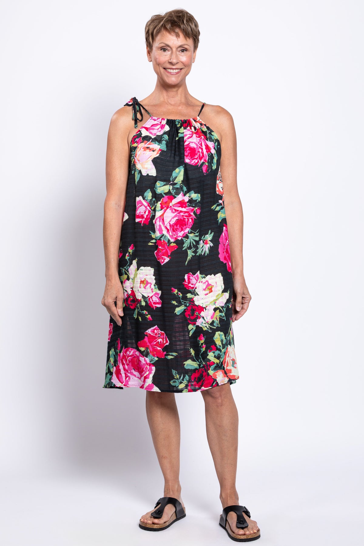 This lightweight beach dress is just so easy. With an adjustable tie on one shoulder, you can choose how this fits at the neckline. Drapes straight throughout the body to just below the knee. A perfect cover up summer dress.