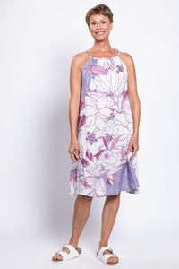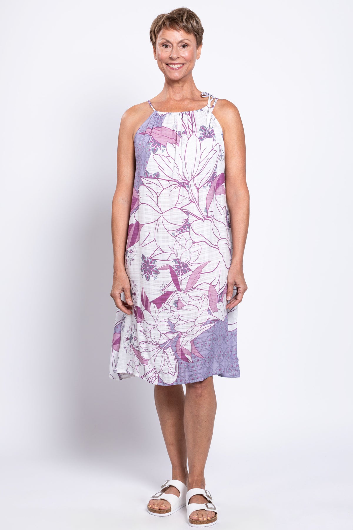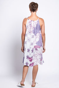 This lightweight beach dress is just so easy.  With an adjustable tie on one shoulder, you can choose how this fits at the neckline. Drapes straight throughout the body to just below the knee. A perfect cover up summer dress.