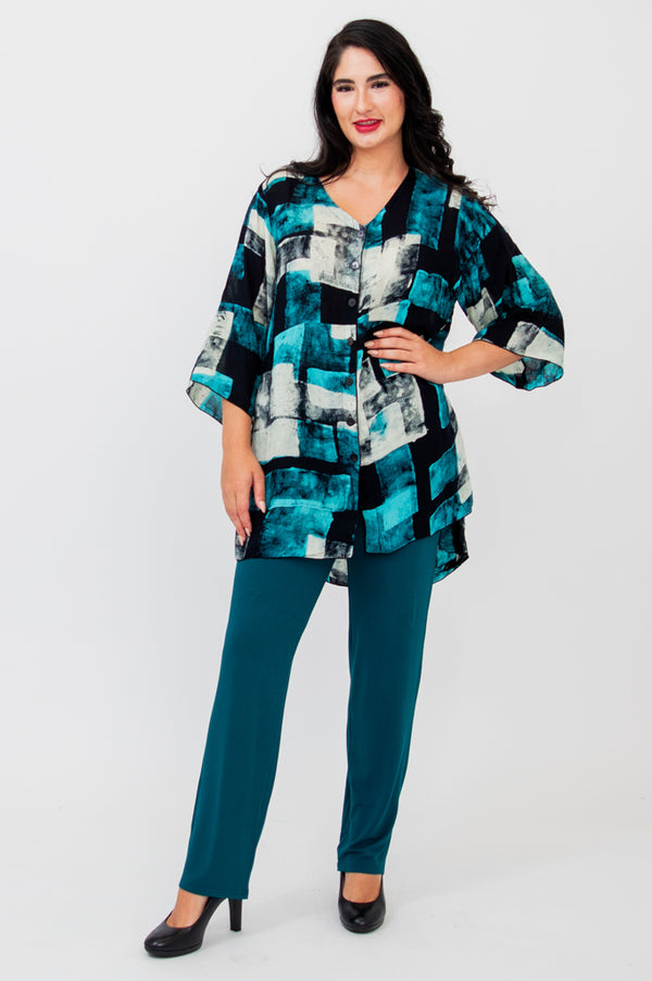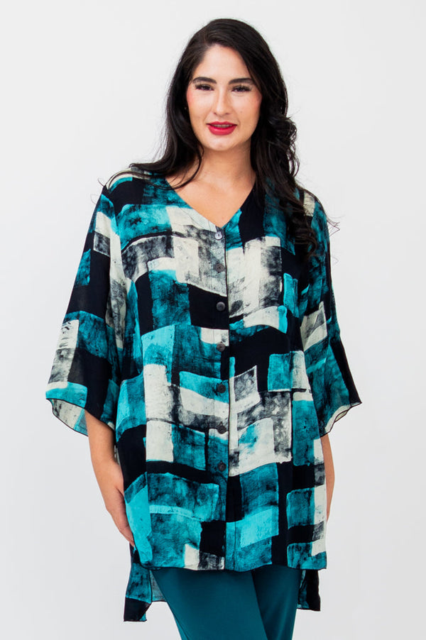 The Darla blouse is free flowing with the feel of a tunic.   A high low hem with side slits, button front and princess seams at the bust add just enough detail to this amazing fabric.