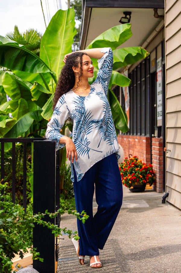 The Dorothy is the ultimate flowy bohemian top. V-neckline, belled sleeves and a shark-bite hemline complete the look. Pair it with leggings or a flowy pant for a cool vibe.