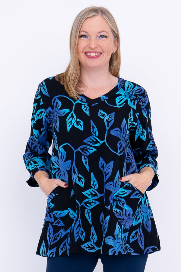 The Evelyn Top has a slightly flowy silhouette and a V neckline. The 3/4 sleeves feature a small notch at the cuff and 2 patch pockets add the right amount of detail. It is perfect to pair with your favourite pant or skirt.
