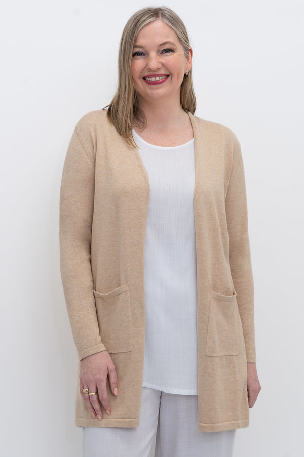Our beloved Justine Sweater is wardrobe must-have! An open style cardigan with pockets for functionality and long, slimming lines. The Justine is designed to fall a bit lower, allowing for good coverage. Layer it over dresses, blouses and sleeveless tops.