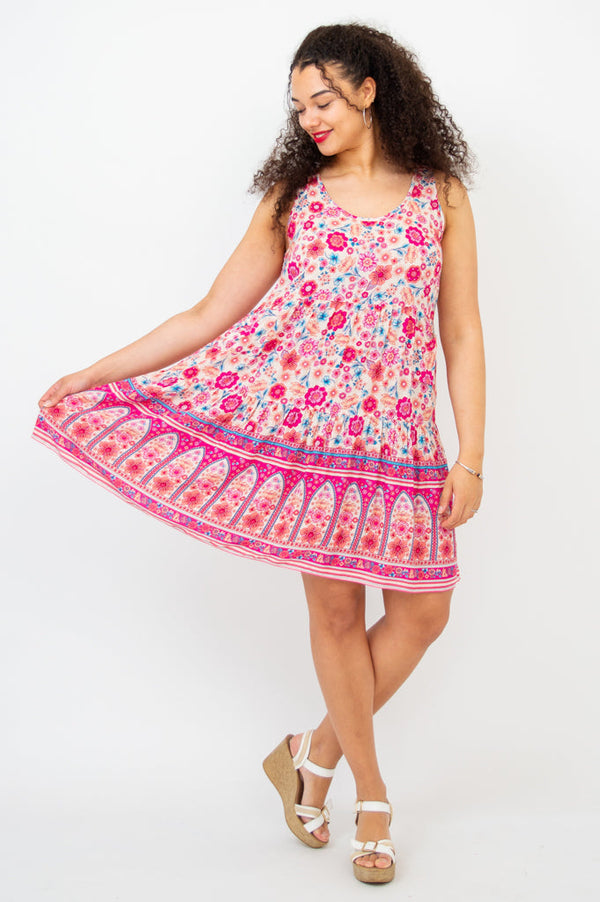 The Kaya dress a breeze to wear, with no cling. A scoop neck and tiers offer freedom of movement and coolness in warm weather.