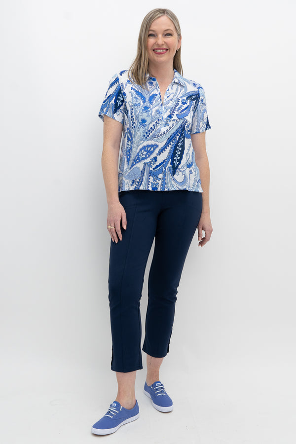 The Lala top features a short sleeve with a 3/4 zip front and collar for a classic look that pairs beautifully with your favourite skirt or pant.