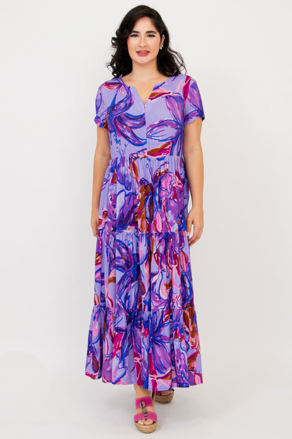 The Laurita dress features a fitted bodice with a V notch at the neck. No buttons or zippers, just a beautiful flowing style!