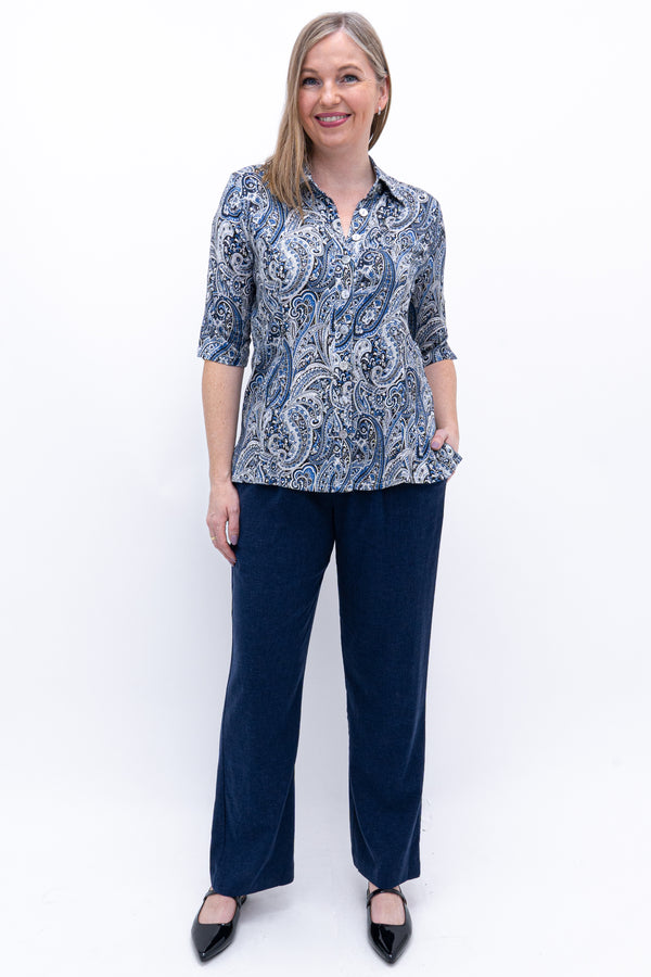 A tailored blouse in cool, breathable Bamboo/Linen fabric. The Lorine features a shirt collar and princess seams. The sleeve falls just below the elbow with a small slit. Pairs nicely with a pant or skirt.