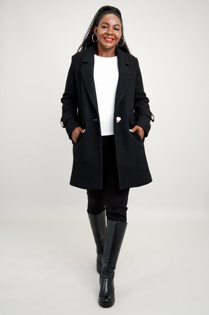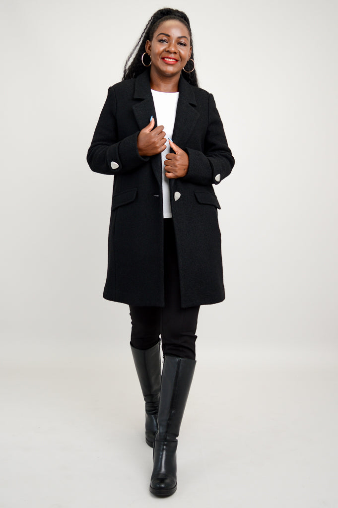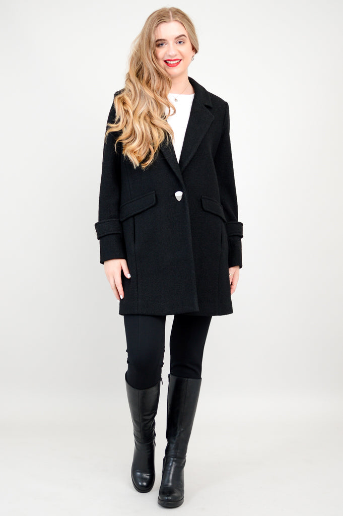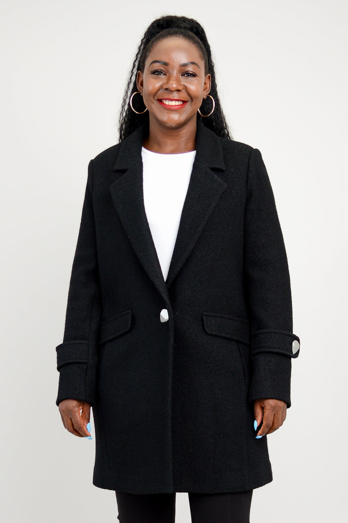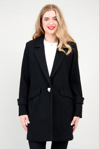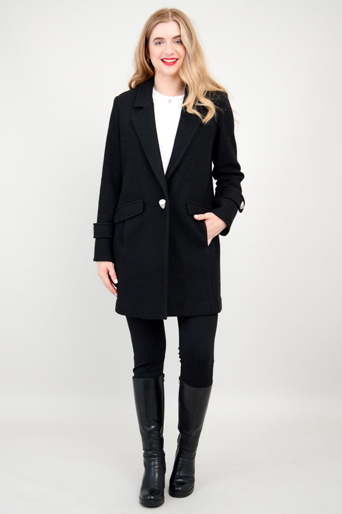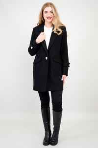 The Milan Coat is single-breasted with one-button closure and a notched lapel. Decorative button flaps at the wrists match the closure button. Faux flaps on the front hide generous inseam pockets and maintain a sleek look. The hemline of the coat falls to mid-thigh, ensuring full coverage of the hips. Wear the Milan with a turtleneck sweater and boots for a chic, city look.