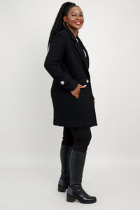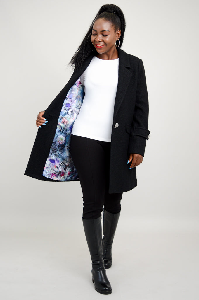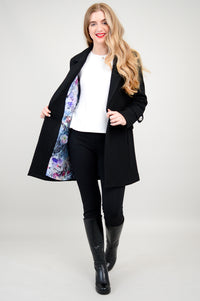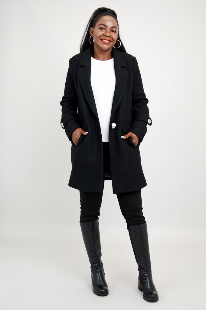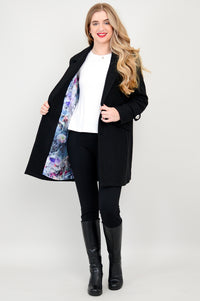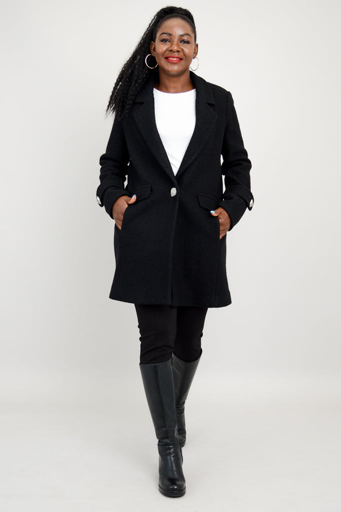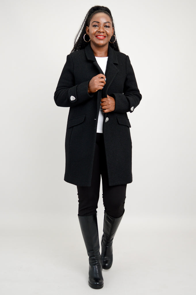 The Milan Coat is single-breasted with one-button closure and a notched lapel. Decorative button flaps at the wrists match the closure button. Faux flaps on the front hide generous inseam pockets and maintain a sleek look. The hemline of the coat falls to mid-thigh, ensuring full coverage of the hips. Wear the Milan with a turtleneck sweater and boots for a chic, city look.