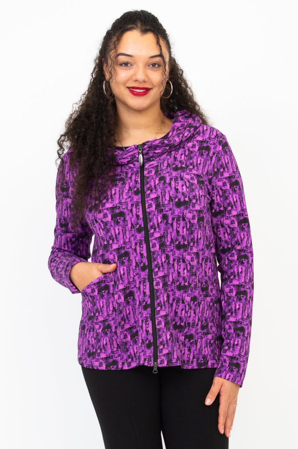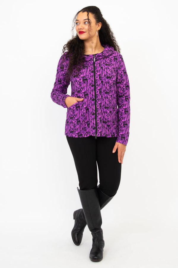 Seymour is a sleek fitted hoodie that hits at the hip.  The stretch bamboo fabric allows all over stretch while providing shape.  Features include a double zipper, slight cowl neck and front pockets.