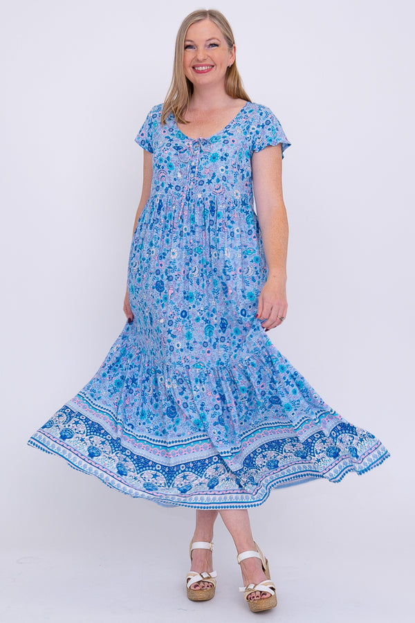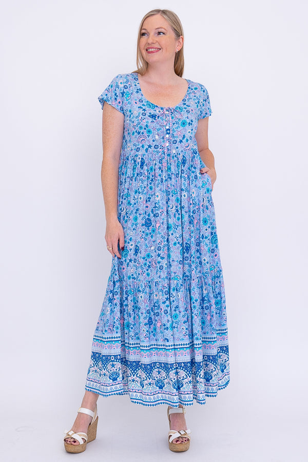 The Sharpie Dress features short flutter sleeves, tiered skirt and pockets. Small shell buttons line the front of the bodice and fabric string ties add detail.
