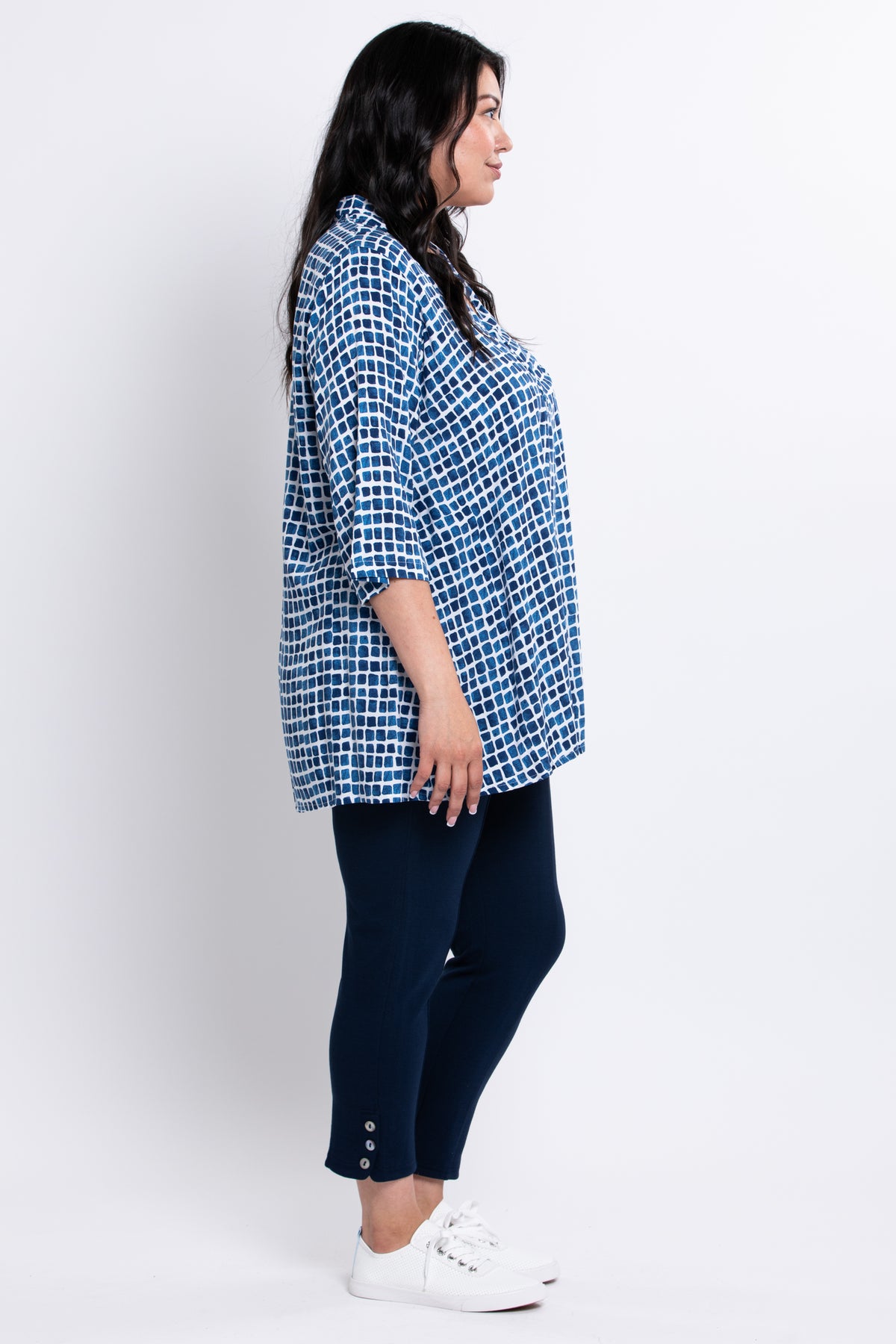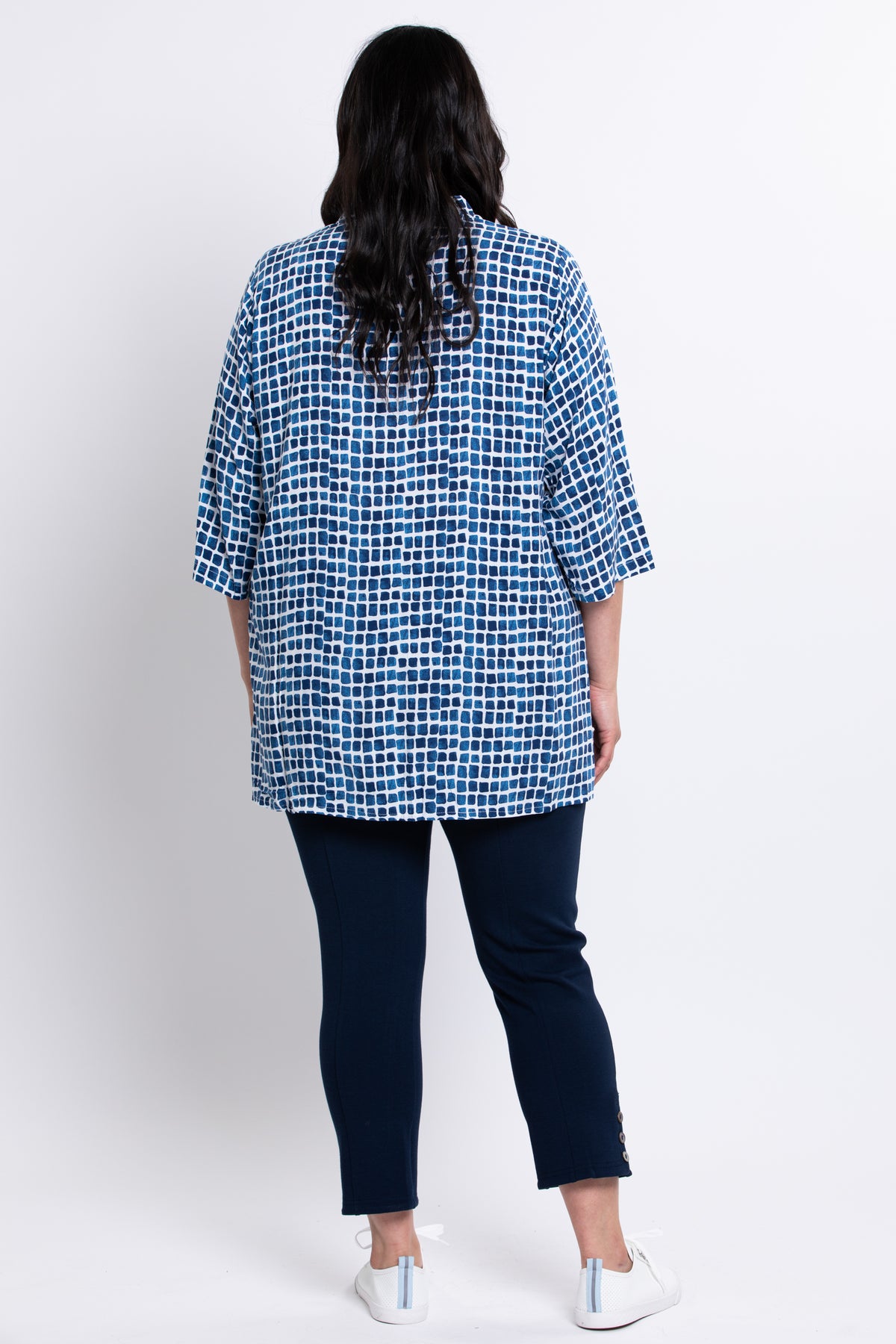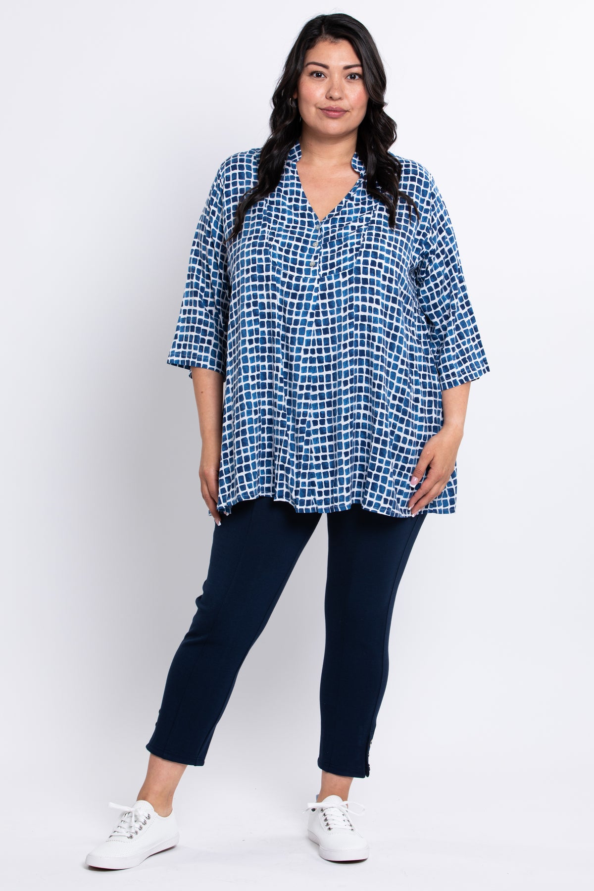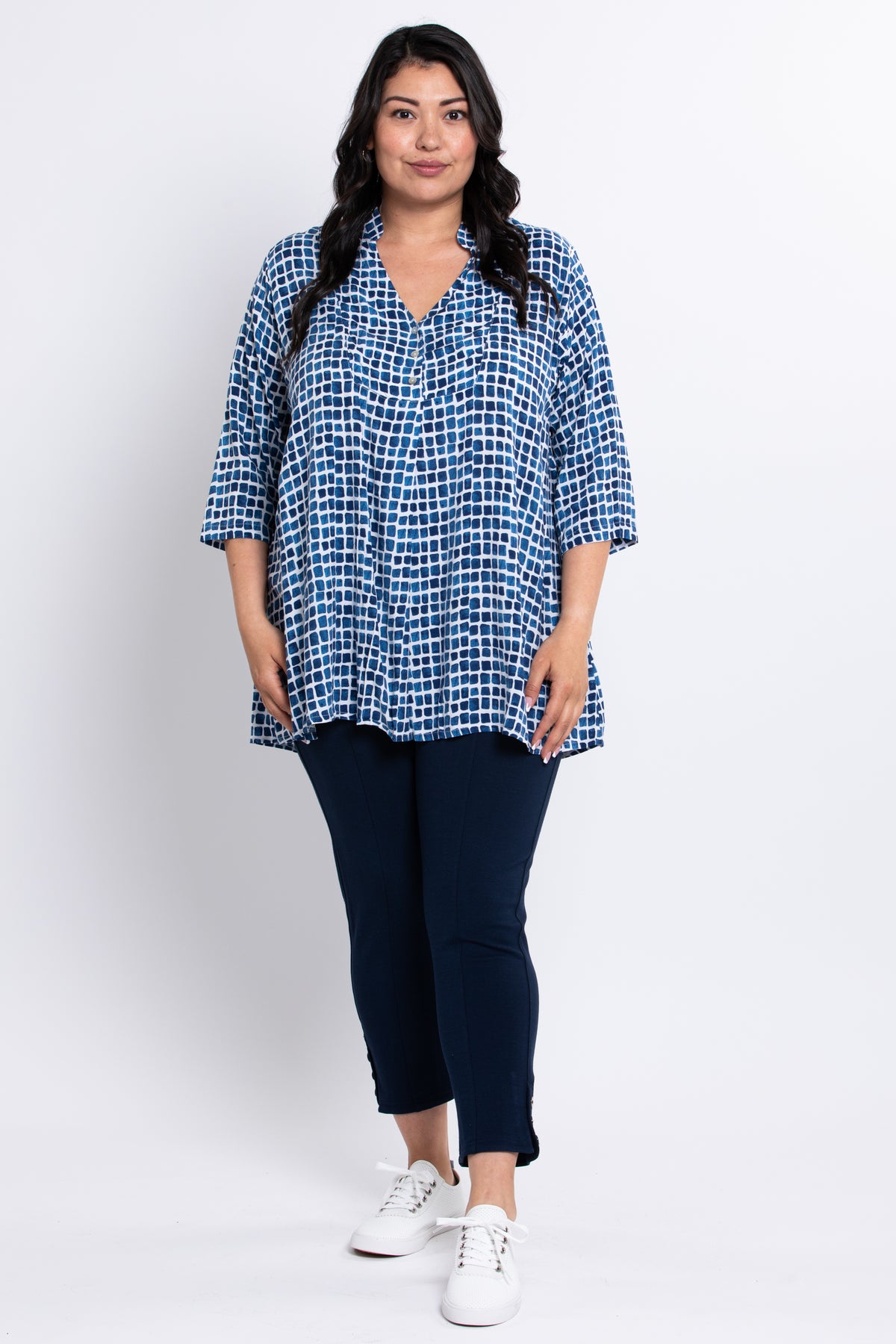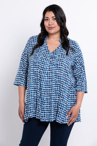 The Shirley blouse is crafted in a beautiful batik fabric. Pullover styling features a slight mandarin collar with a V-Neck opening. This blouse features 3/4 sleeves and a single pleat down the front.