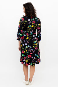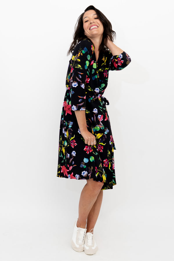 The Zoe dress is a classic wrap style featuring a tie belt and pockets. Timeless style and comfort all in one.